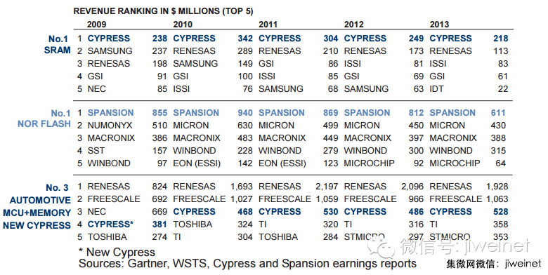 赛 普拉斯与 ISSI 同样以 SRAM 市场为主,面临了反垄断的顾虑,若以 Gartner 与各公司的营收数据推估,2013 年赛普拉斯在 SRAM 的收益仅 2.18 亿,与 ISSI 的 8,300 万营收相加,约莫 3 亿,占 2013 年 SRAM 9.8 亿总营收的 30.6%。